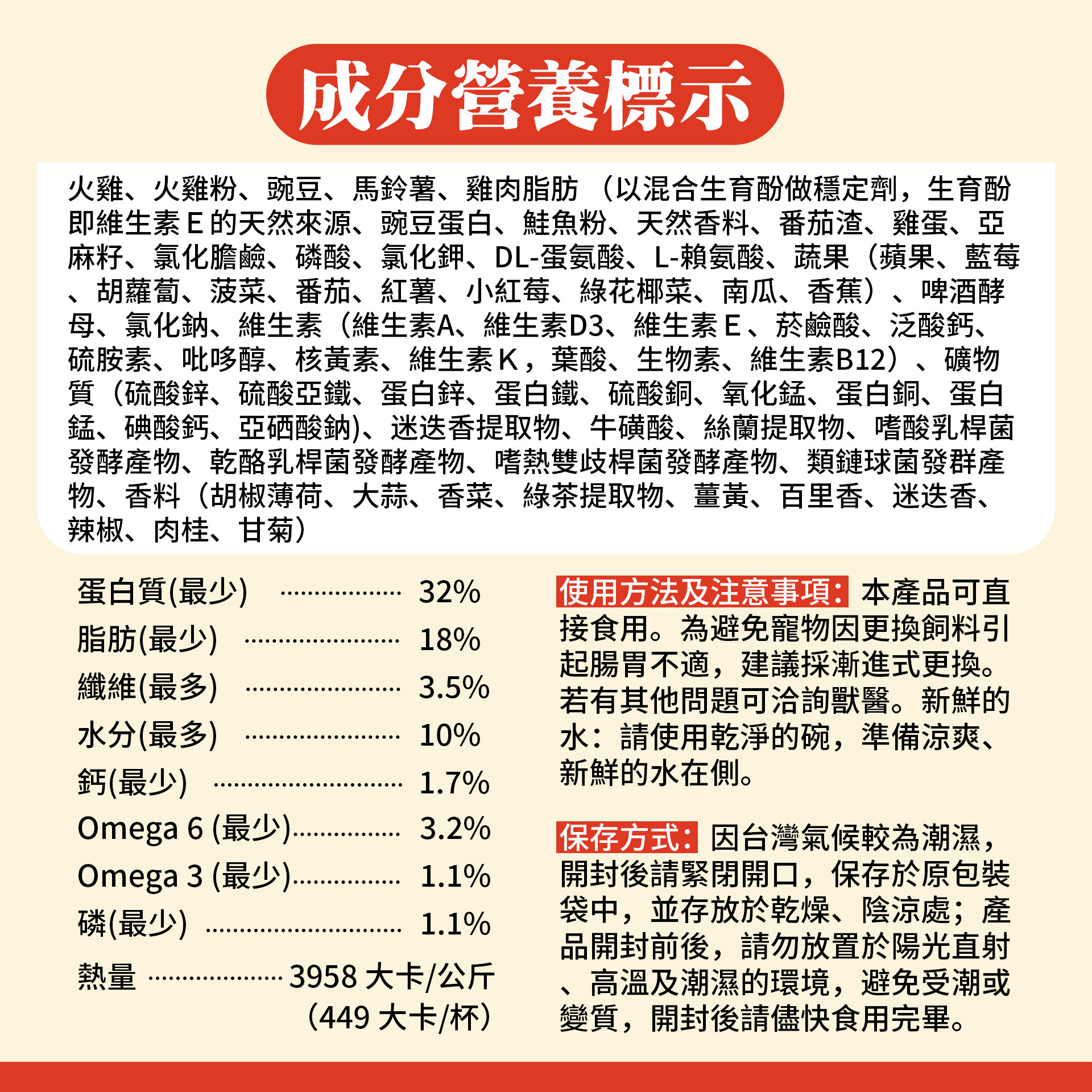 火雞、火雞粉、豌豆、馬鈴薯、雞肉脂肪 (以混合生育酚做穩定劑,生育酚即維生素E的天然來源、豌豆蛋白、款氨酸、鮭魚粉、天然香料、番茄渣、雞蛋、亞麻籽、氯化膽鹼、磷酸、氯化鉀、DL-蛋氨酸、L-賴氨酸、蔬果(蘋果、藍莓、胡蘿蔔、菠菜、番茄、紅薯、小紅莓、綠花椰菜、南瓜、香蕉)、啤酒酵母、氯化鈉、維生素(維生素A、維生素D3、維生素E、煙酸、泛酸鈣、硫胺素、吡哆醇、核黃素、維生素K,葉酸、生物素、維生素B12)、礦物質(硫酸鋅、碗酸亞鐵、蛋白鋅、蛋白鐵、硫酸銅、氧化錳、蛋白銅、蛋白錳、碘酸鈣、亞硒酸鈉)、迷迭香提取物、牛磺酸、絲蘭提取物、嗜酸乳桿菌發酵產物、乾酪乳桿菌發酵產物、嗜熱雙歧桿菌發酵產物、類鏈球菌發群產物、香料(胡椒薄荷、大蒜、香菜、綠茶提取物、薑黃、百里杳、迷送香、辣椒、肉桂、甘菊)