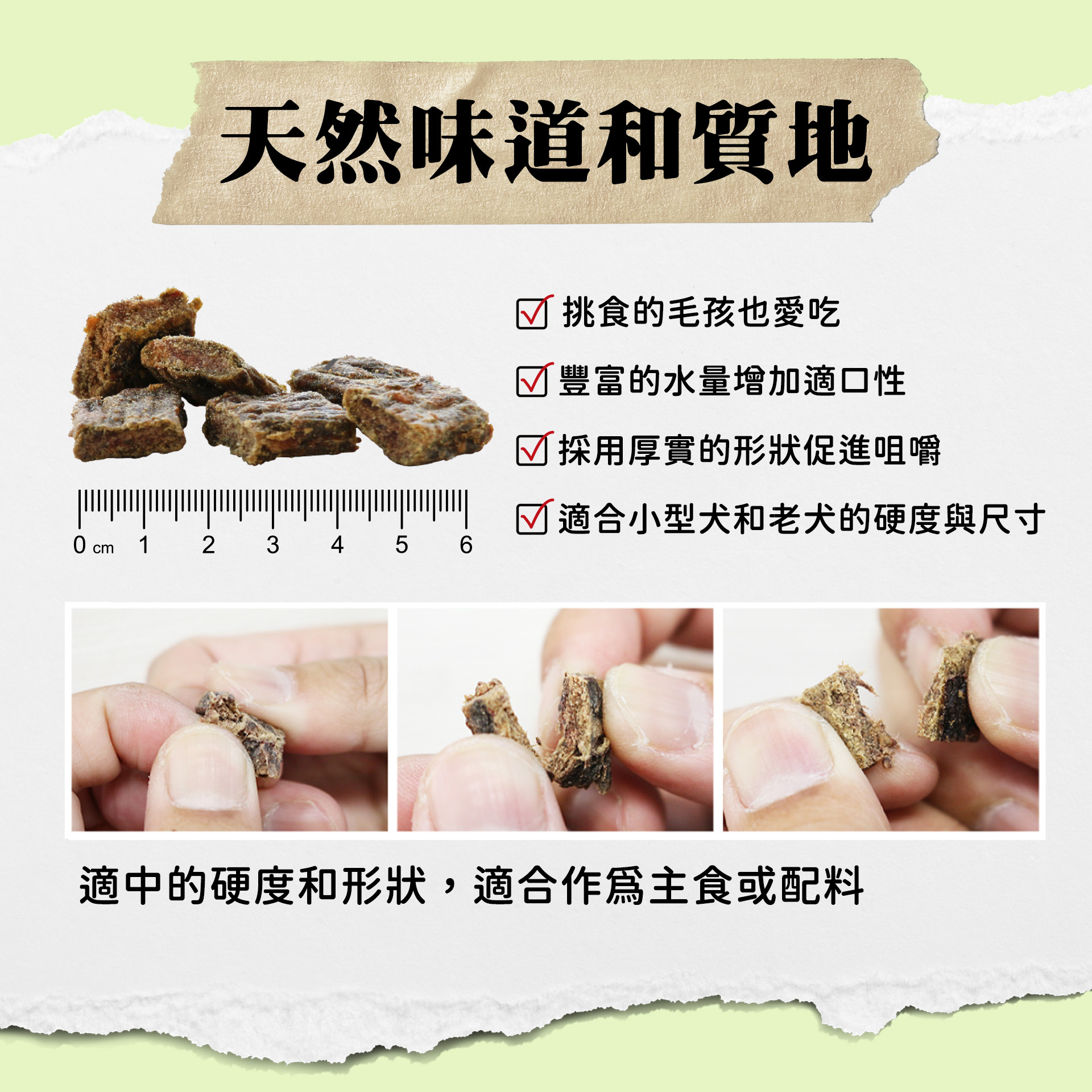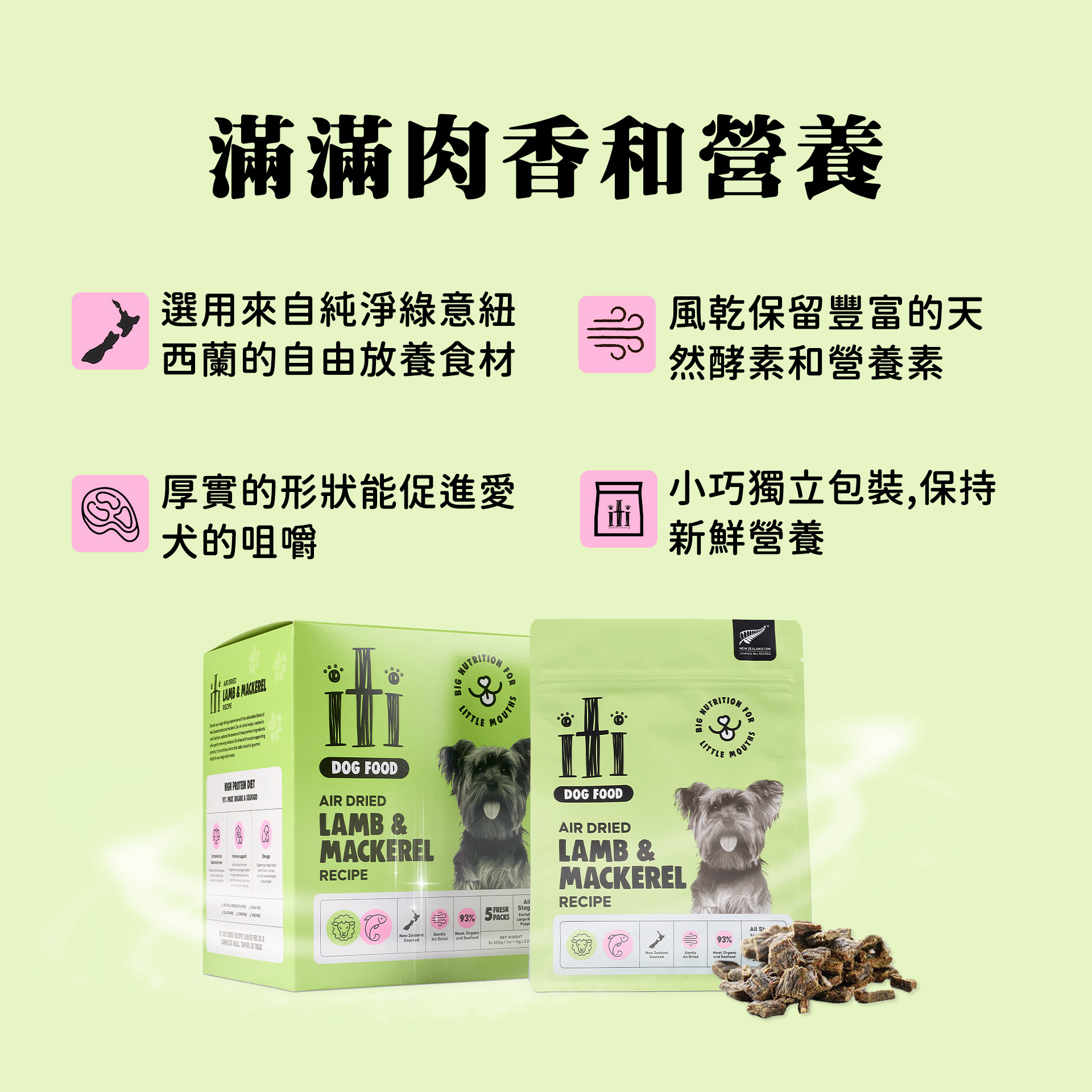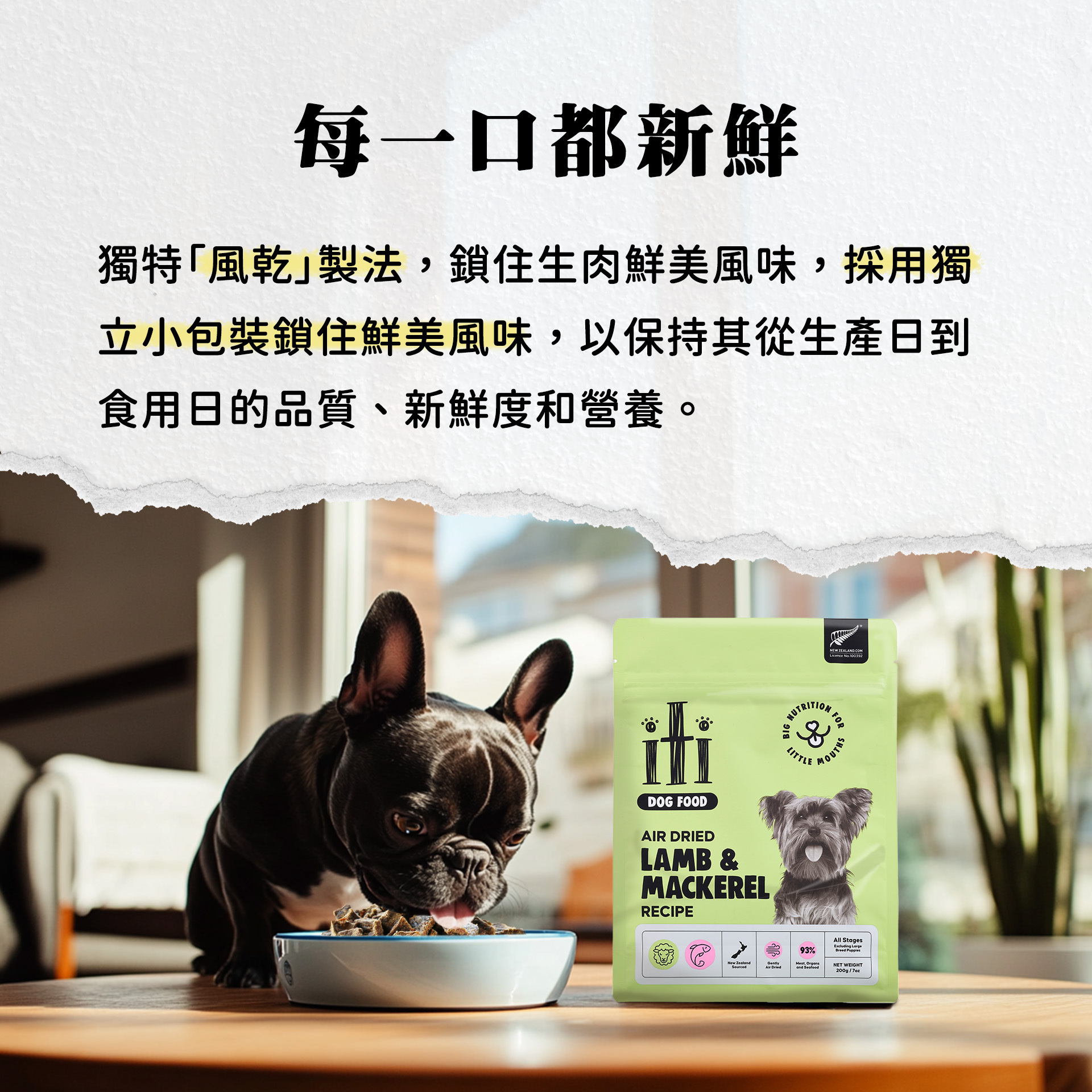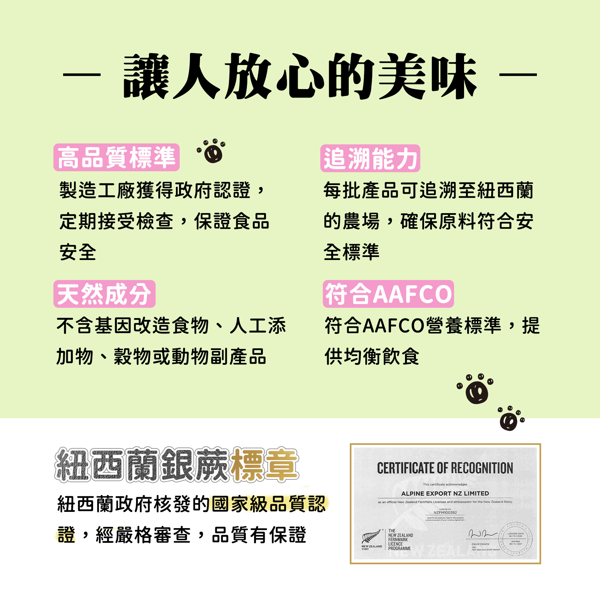 羊肉、羊肺、羊肝、鯖魚、亞麻籽、卵磷脂、椰子甘油、綠唇貽貝、羊骨、磷酸二鉀、鹽、碳酸鈣、氯化膽鹼、牛磺酸、天然抗氧化劑、鐵、鋅、維生素E、硒、銅、維生素B2、維生素B12、葉酸。