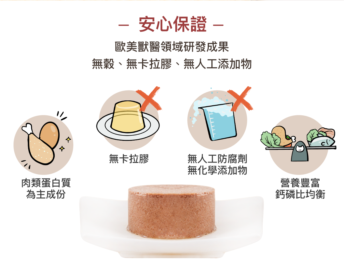 康復階段的貓通常會有較高的能量和水分需求。選用高生物利用率最優質的雞胸肉塊調製可以刺激貓咪飲水慾望和食慾。