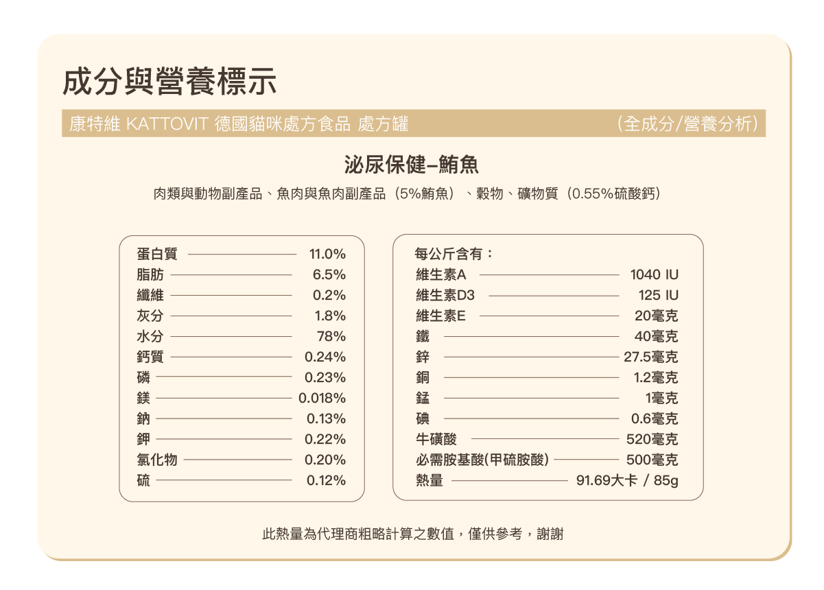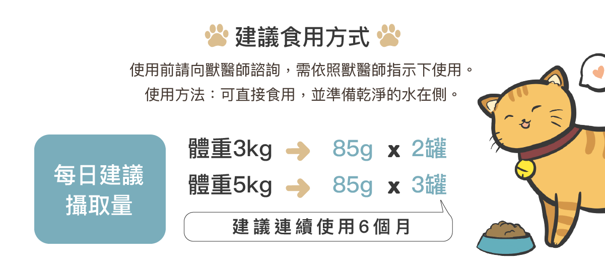 ★每日建議攝取量:體重3kg可食用85g*2罐;體重5kg可食用85g*3罐
