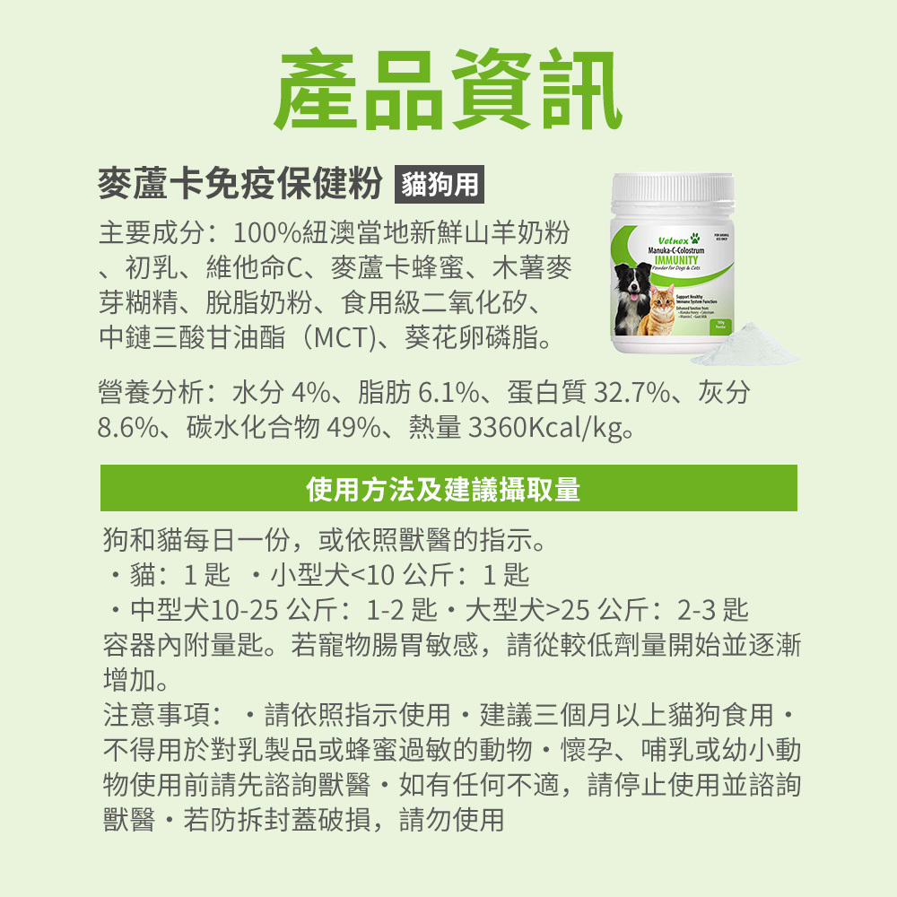 建議三個月以上狗貓使用,每日一份,或依照獸醫的指示。