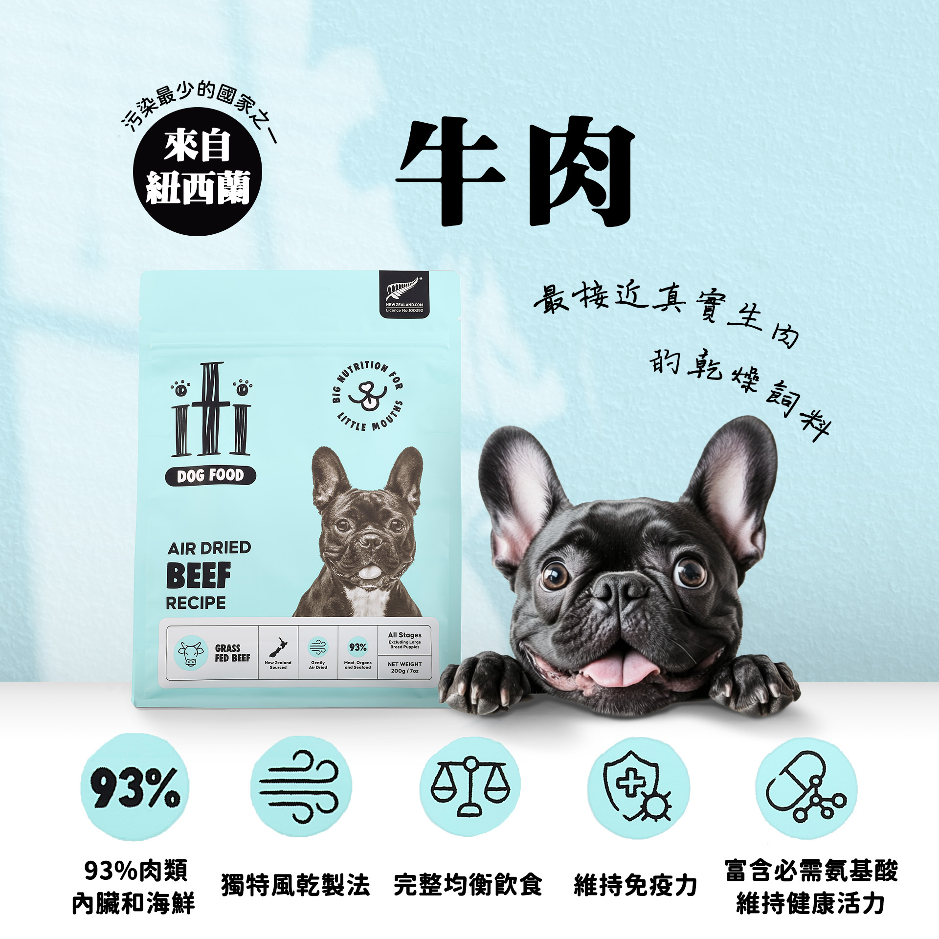 牛肉、牛肺、牛肝、椰子甘油、亞麻籽、綠唇貽貝、磷酸二鉀、鹽、碳酸鈣、氯化膽鹼、牛磺酸、天然抗氧化劑、鐵、鋅、維生素E、硒、銅、維生素B1、A、B3 、B5、錳、維生素 B2、B6、D、生物素、維生素 B12、碘、葉酸。