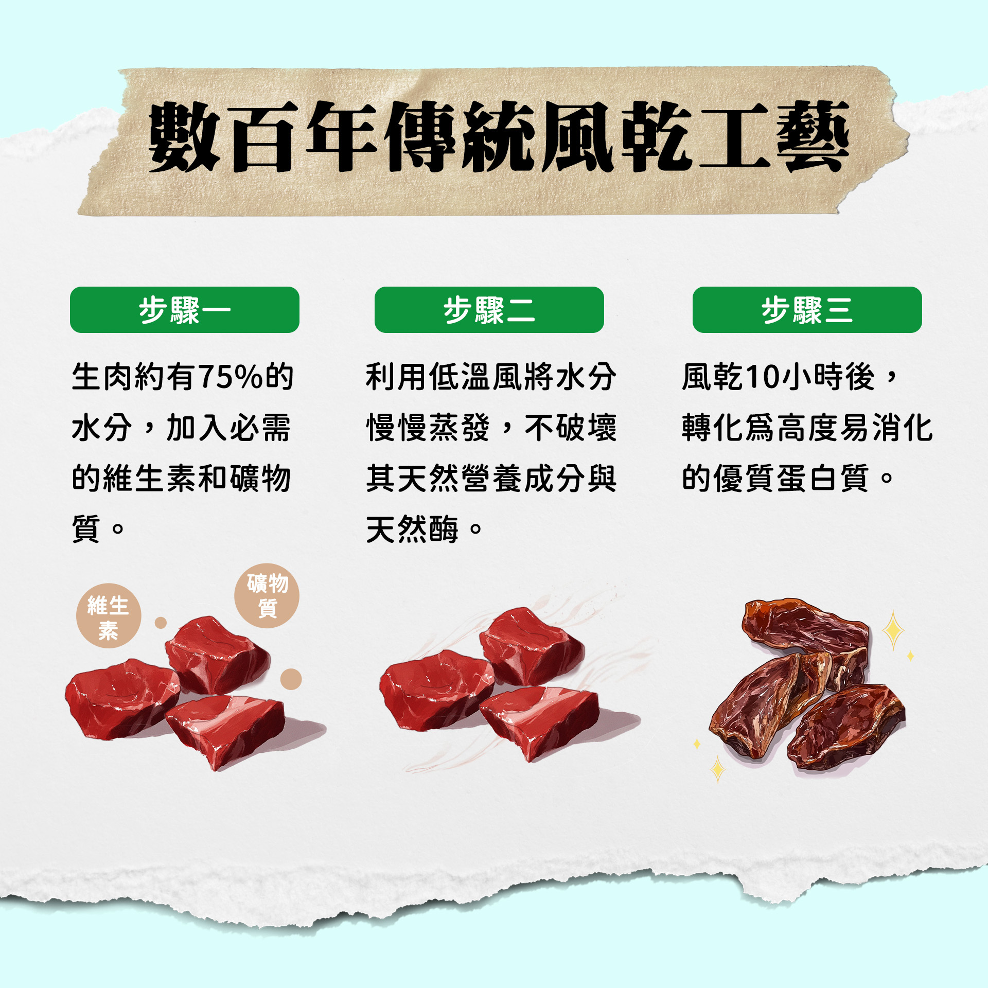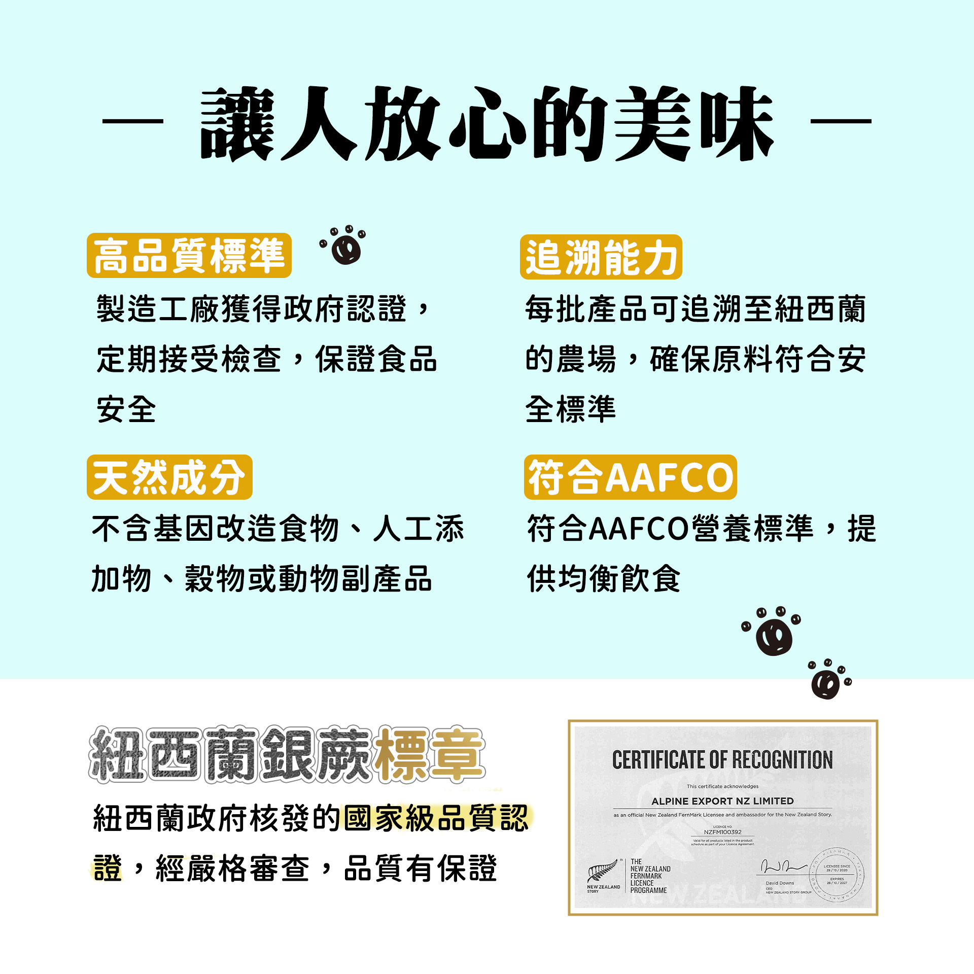 羊肉、羊肺、羊肝、鹿肉、亞麻籽、綠唇貽貝、卵磷脂、椰子甘油、羊骨、磷酸二鉀、鹽、碳酸鈣、氯化膽鹼、牛磺酸、天然抗氧化劑、鐵、鋅、維生素E、硒、銅、維生素B1、維生素B5、葉酸、鉀、鈣。